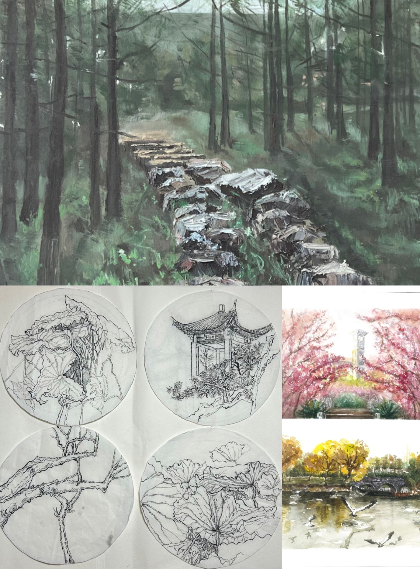 作品《谢师亭与沁湖》以谢师亭与湖心岛为核心,用荷叶、湖水、廊桥等校园风景元素加以点缀,构成了一副独具我校特色的水墨风景画。“在水墨画中,平时司空见惯的谢师亭居然另有一番美意!”作者刘玥含说道,“中国画的形式能够很好地呈现我校的文化底蕴,也给了我们一次静下心来观察校园的机会。”