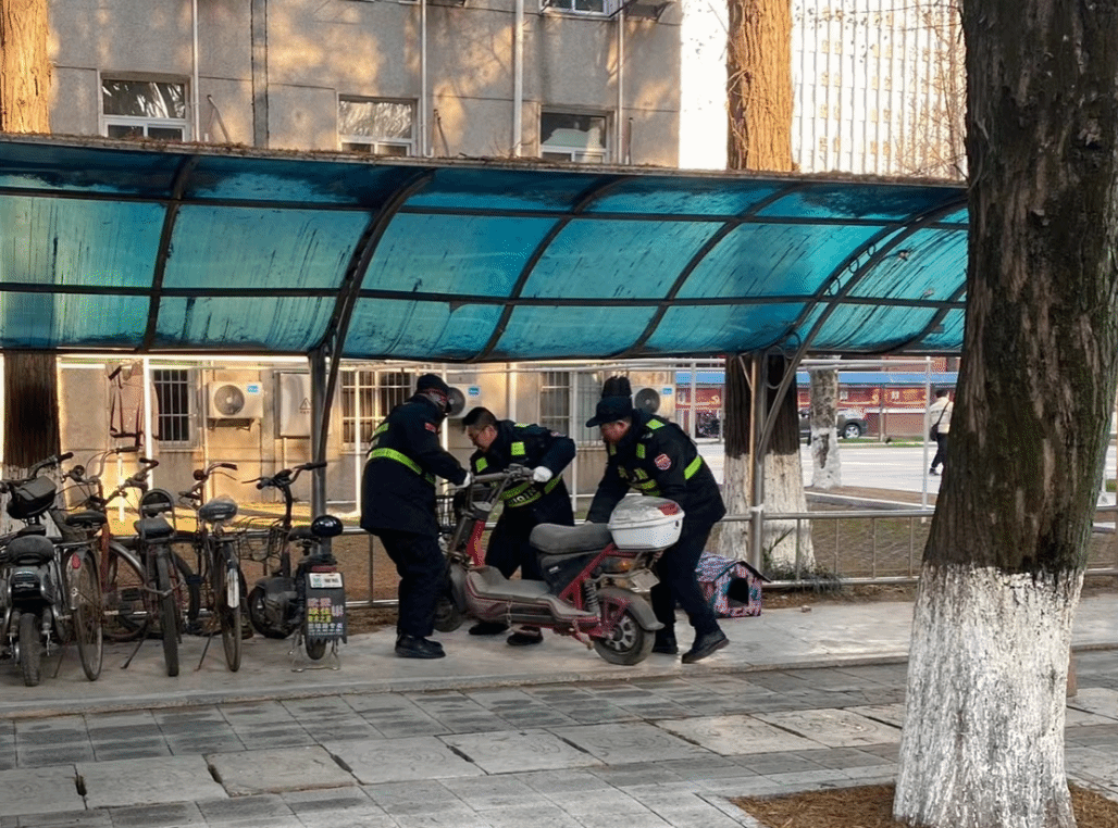 在废旧电动车自行车清理过程中,校卫队员按照不同区域和分工明确、相互配合,对每辆电动车自行车进行严格筛选排查,确认是废弃的车辆后再清理。并将清理出来的废旧车辆进行集中存放,统一管理,以便师生员工认领。