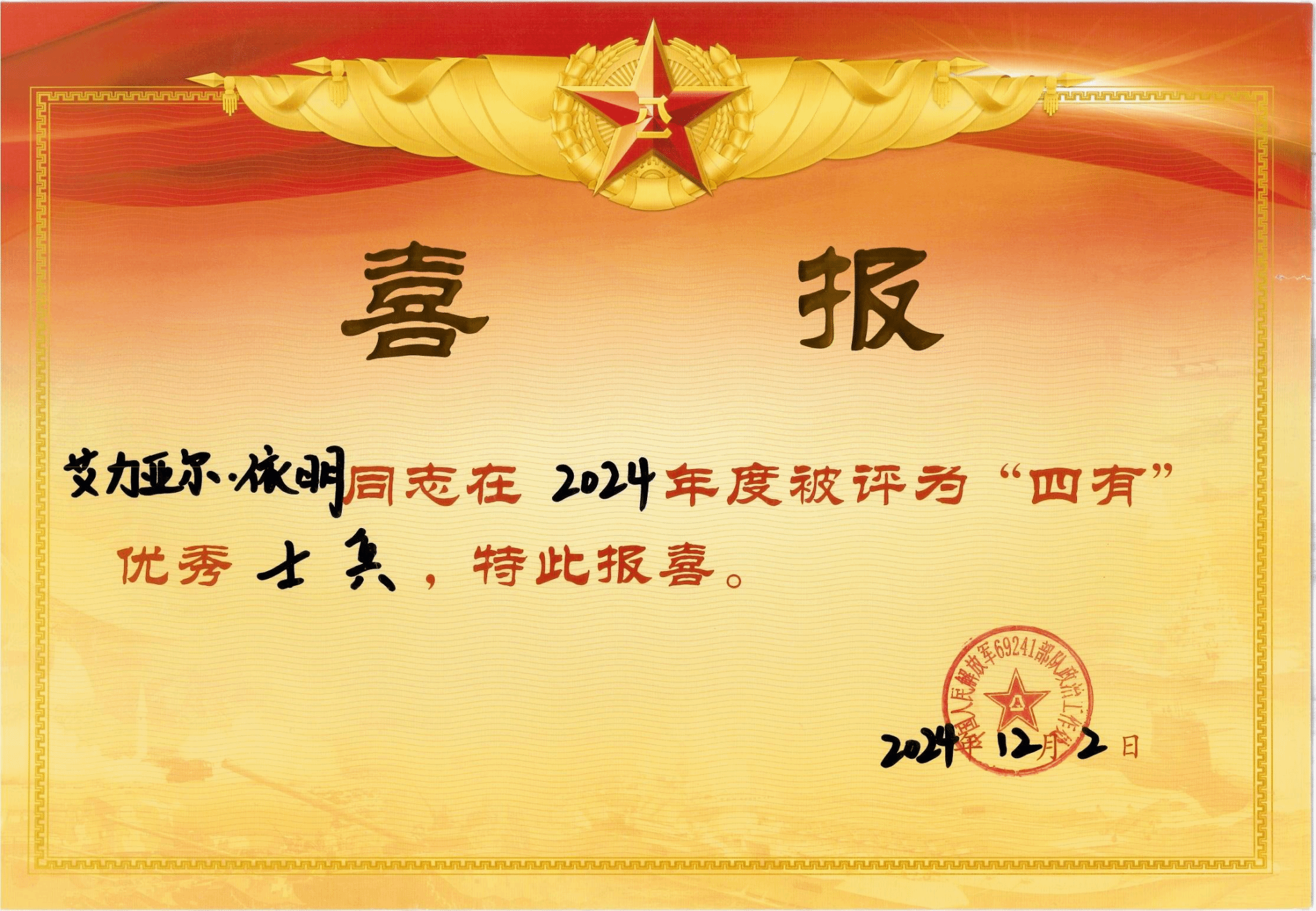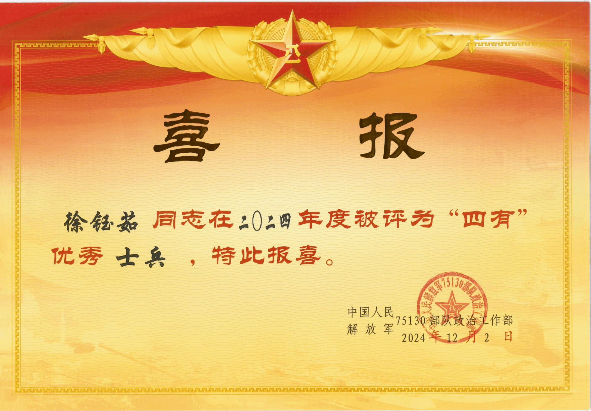 四有”优秀士兵是由部队评选,颁发由中央军委统一规范的奖状、证章、证书,并使用军队喜报专递信封寄发喜报的年度荣誉。“四有”优秀士兵的获得证明了该同学参军入伍后,将我校“坚韧不拔、勇承重载,崇实求精、表里如一”的钢铁品质,应用到部队军事训练、政治学习与日常工作中,成长为“有灵魂、有本事、有血性、有品德”的优秀中国军人。四名同学的突出表现,充分展现了我校人才培养的卓越成效和集成效应,必将激励着更多的学生投身国防建设,为实现强军目标贡献青春力量。
