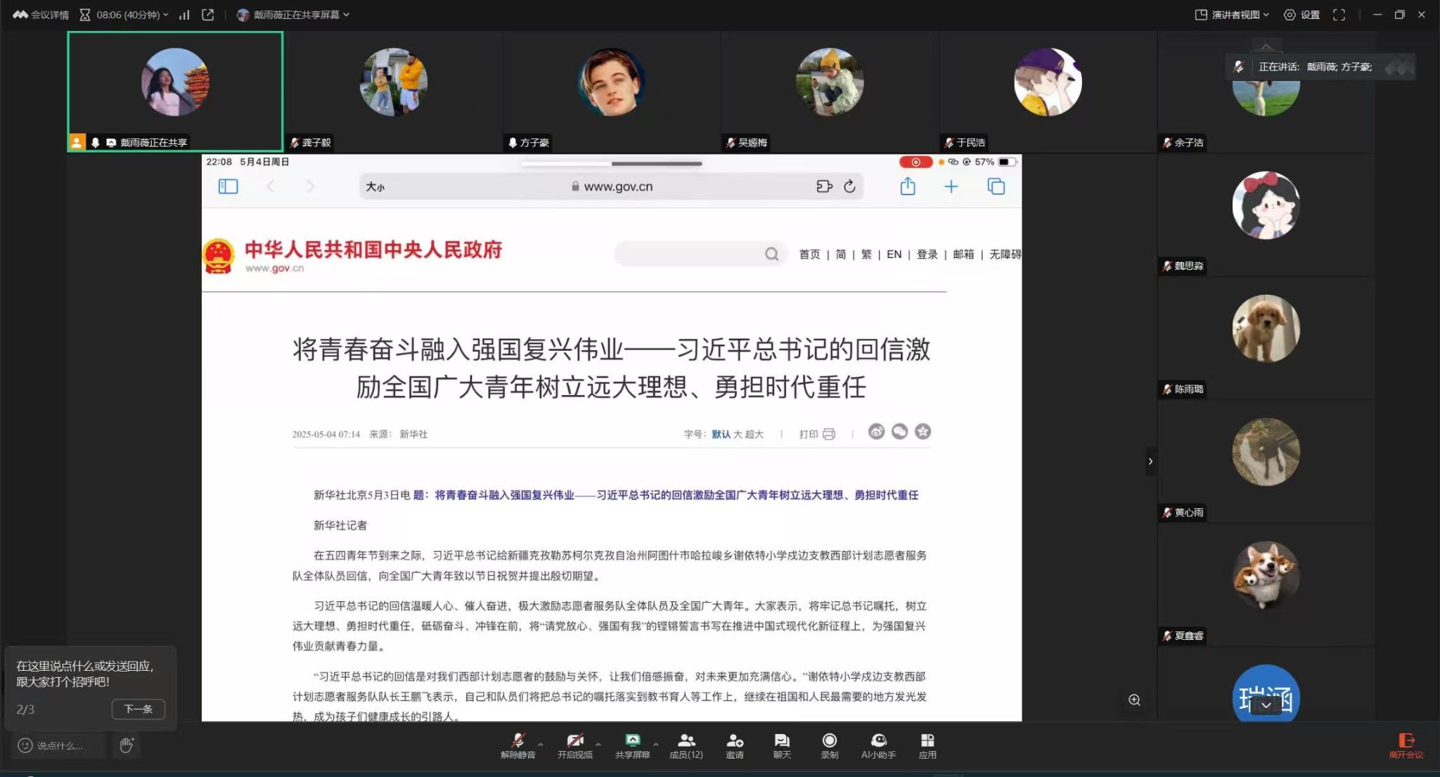 武科大网讯(通讯员牛子轩)在五四青年节到来之际,中共中央总书记、国家主席、中央军委主席习近平给新疆克孜勒苏柯尔克孜自治州阿图什市哈拉峻乡谢依特小学戍边支教西部计划志愿者服务队全体队员回信,向全国广大青年致以节日祝贺并提出殷切期望。这封回信让我校研究生支教团全体成员备受鼓舞,研支团成员逐字研读回信内容,结合自身实际和西部支教经历展开热烈讨论。